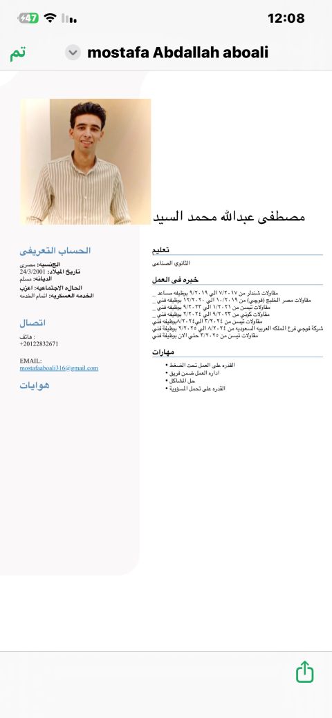 مصطفى عبدالله محمد السيد مصري فني تركيب ميكانيكا مصاعد خبرة 8 سنين ابحث عن عمل موجود في مصر وأقدر اجي زيارة لو متوفر شغل
