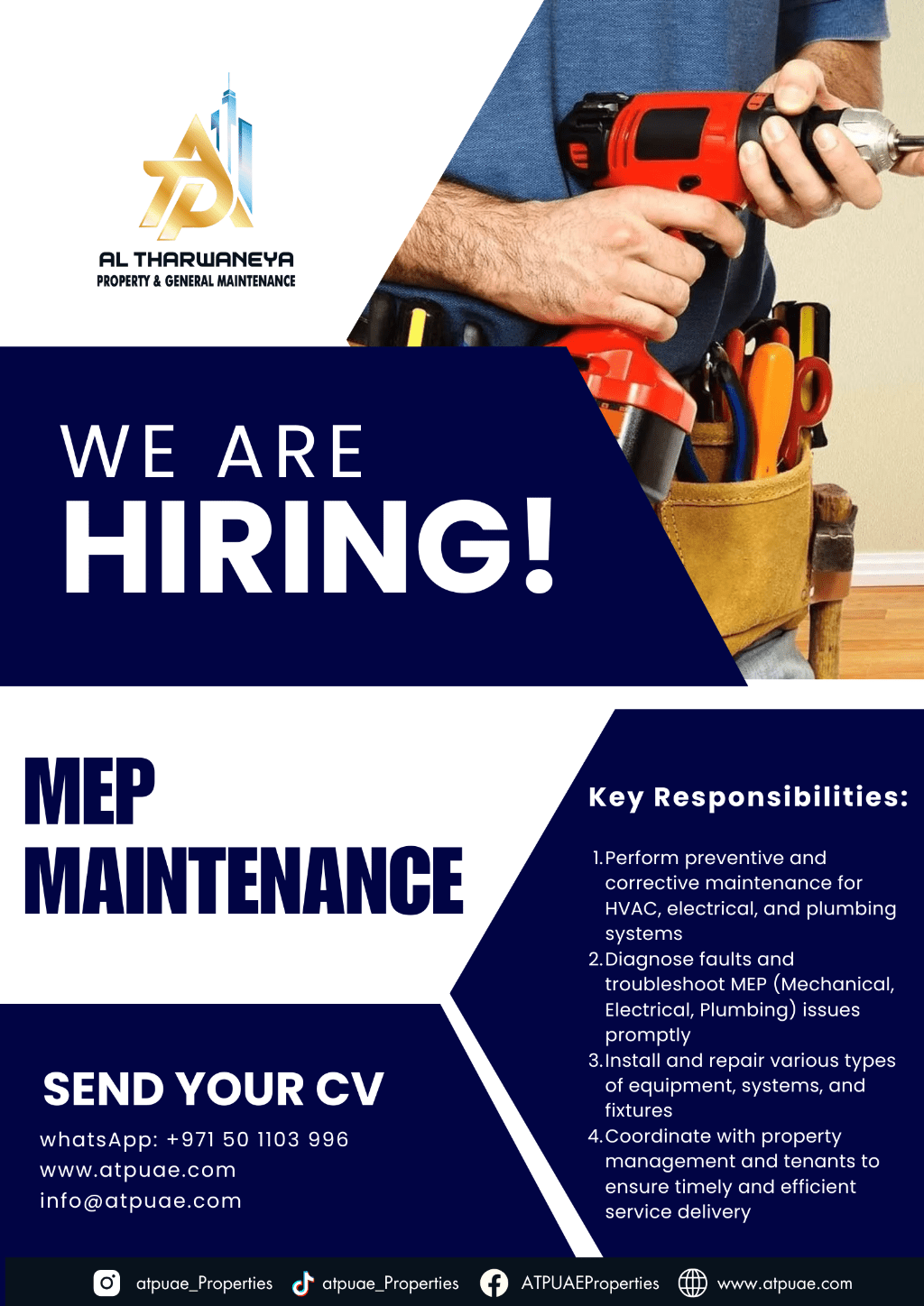 WE ARE HIRING - MEP Maintenance Staff in Abu Dhabi Khaldiya Join our skilled team at Al Tharwaneya Property & General Maintenance and grow your career in one of the UAE’s leading property maintenance companies. We are looking for experienced in HVAC, electrical, and plumbing systems to support our operations in Abu Dhabi. Location Abu Dhabi, Khaldiya St. UAE Send your CV