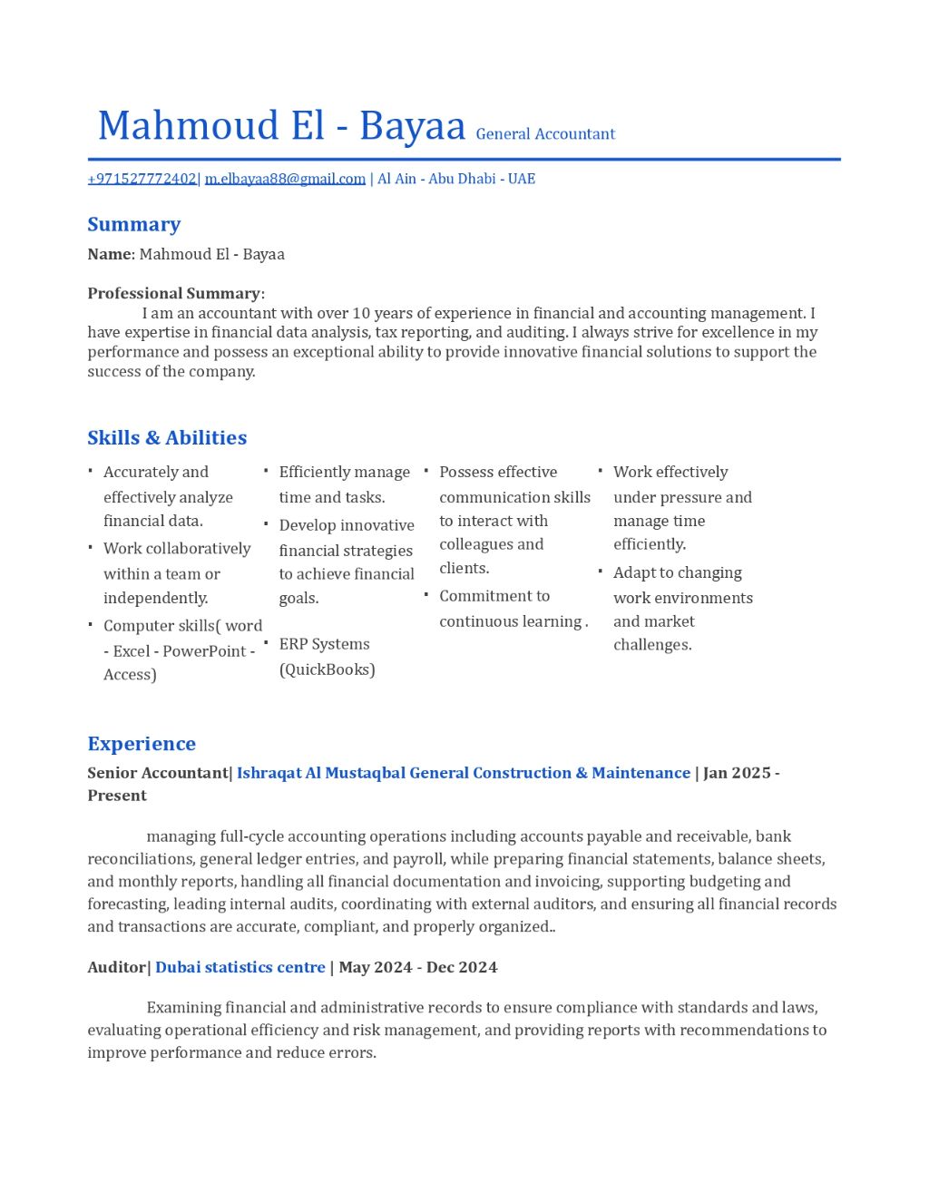 محاسب خبرة في الدولة 12 سنة عمل اليوميات والحسابات وتسوية البنوك والاقرارات الضريبية العمل على برنامج كويك بوكس العمل على برامج مايكروسوفت أوفيس رخصة قيادة