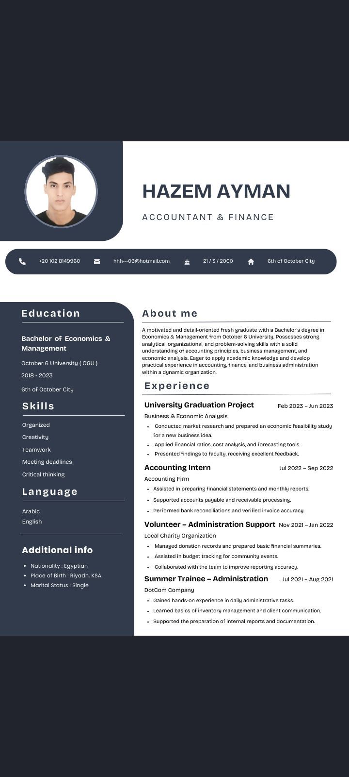 أنا مهندس حازم أيمن مصري الجنسية حاصل على بكالوريوس اقتصاد وادارة جامعة 6 أكتوبر القاهرة