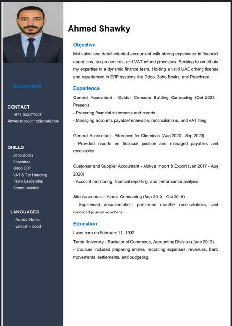 Ahmed Ezzat 29 years Egyptian looking for job Experienced professional in café and restaurant management, sales, accounting, and inventory management. Skilled in Foodics POS, Odoo, Excel reporting, customer service, payroll, and multi - branch operations. Strong ability to manage staff, optimize costs, and ensure smooth operations in hospitality and retail sectors