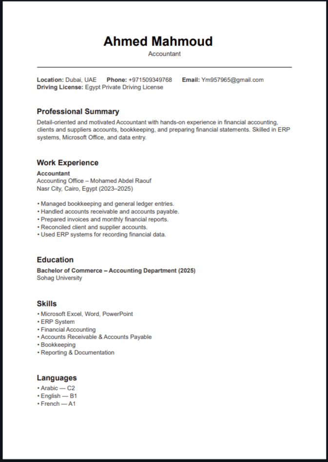 أنا حاصل علي بكالوريوس تجارة شعبة محاسبة مقيم في دبي وعجمان وابحث عن فرصة عمل محاسب واداري خبراتي في مكتب محاسبه سنة وخبرتي 3 شهور في شركة مقاولات في دبي ولدي معرفة جيده بالضريبة واعمل علي الأكسيل جيد جدا وعملت فترة بسيطة علي erb وأل odoo وQuickbooks وابحث عن فرصة عمل أفضل في شركة لزيادة خبرتي أكثر لأنه حابب أطور من نفسي ومعنديش مشكلة من أي امارة في الامارات بس الشركة توفر لي سكن