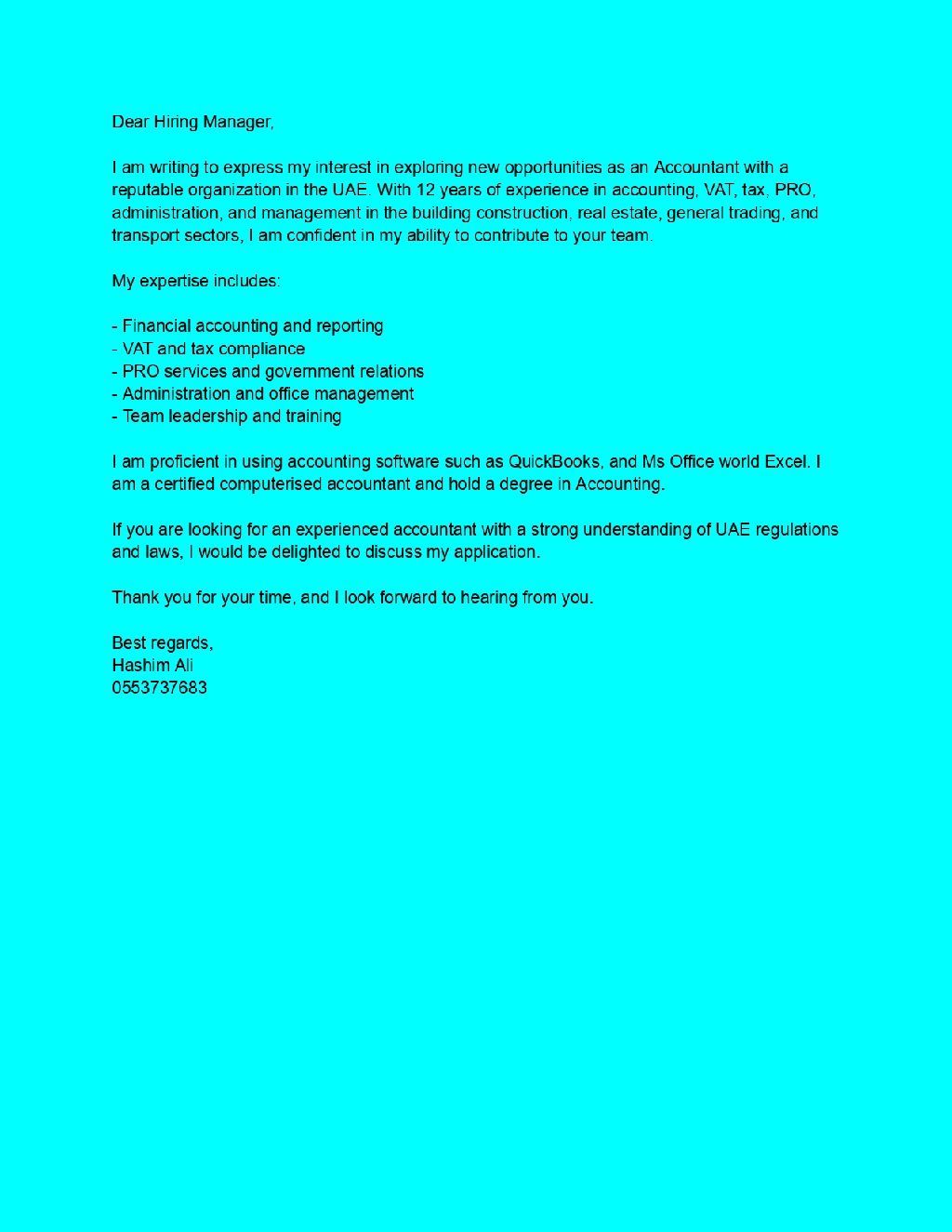 I am writing to express my interest in exploring new opportunities as an Accountant with a reputable organization in the UAE. With 12 years of experience in accounting, VAT, tax, PRO, administration, and management in the building construction, real estate, general trading, and transport sectors