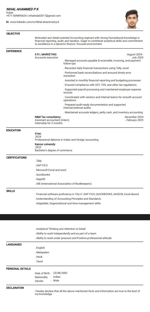 NIHAL AHAMMED P K Dubai 971 - 509890624 OBJECTIVE Motivated and detail - oriented Accounting professional with strong foundational knowledge in financial reporting, audit, and taxation. Eager to contribute analytical skills and a commitment to excellence in a dynamic finance - focused environment. Professional Experience SRL MARKETING Accounts Executive August 2024 - July
