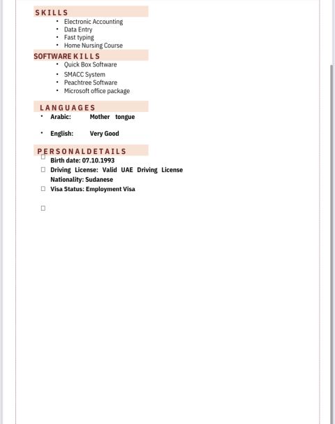 أنا محاسب مالي، سوداني الجنسية، لدي شهادة البكالوريوس في المحاسبه الماليه، والخبرة الكافيه في علم المحاسبة والتدقيق، أجيد برنامج الأكسيل شيت، وبرنامج أودو كلاود، ابحث عن بيئة عمل مرنه، متواجد حاليا في إمارة دبي