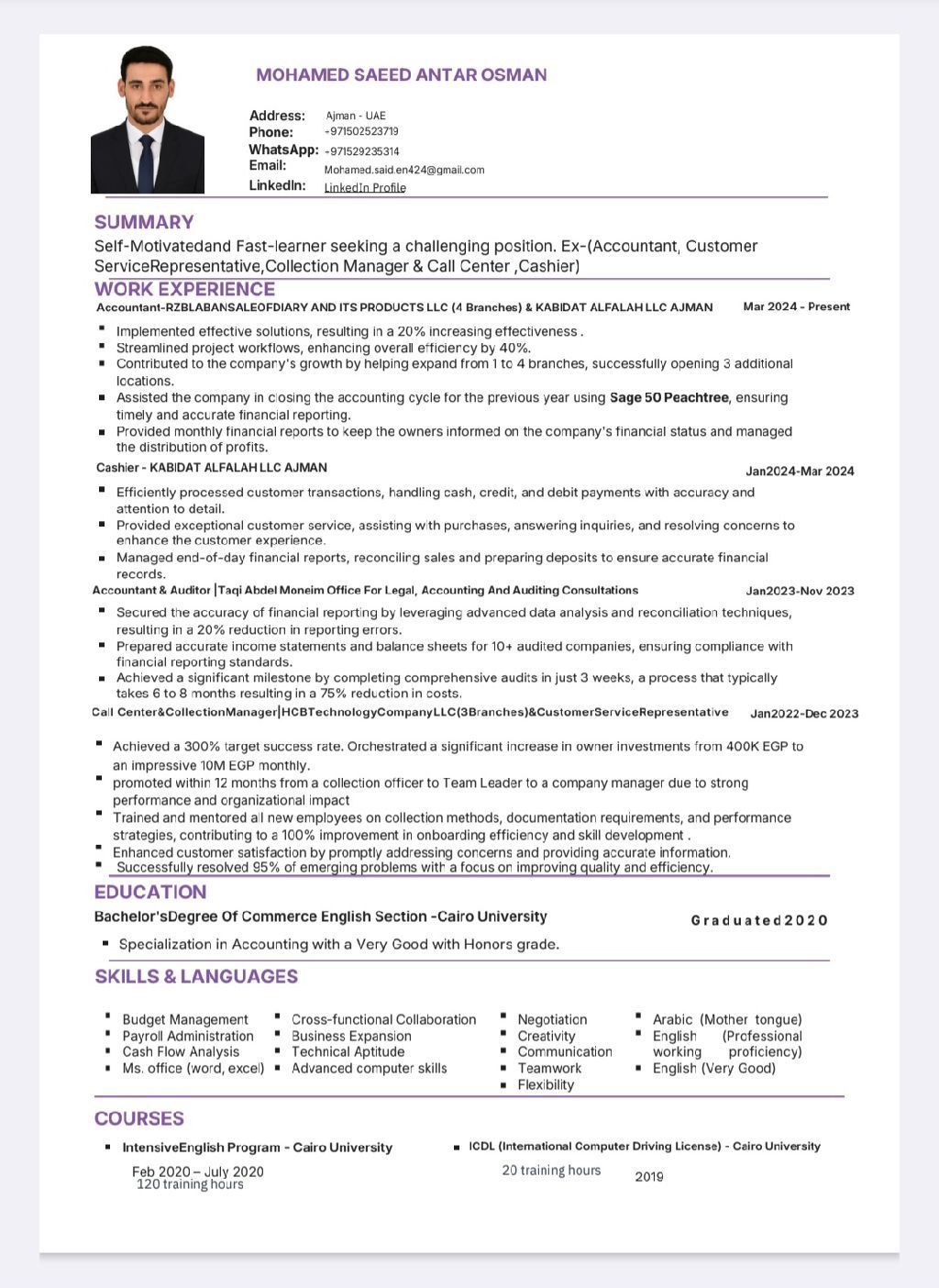 اسمي محمد سعيد (مصري) وابحث علي وظيفة محاسب. أحمل درجة بكالوريوس في المحاسبة باللغة الانجليزية (مع مرتبة الشرف) ولدي خبرة واسعة 4 سنوات منهم سنتين في الامارات (عجمان) في اعداد التقارير المالية، ومحاسبة الفروع، وبرنامج Sage 50 (Peachtree) Excel/ word. سيرتي الذاتية مرفقة. يسعدني مناقشة أي تفاصيل. محمد سعيد + WA