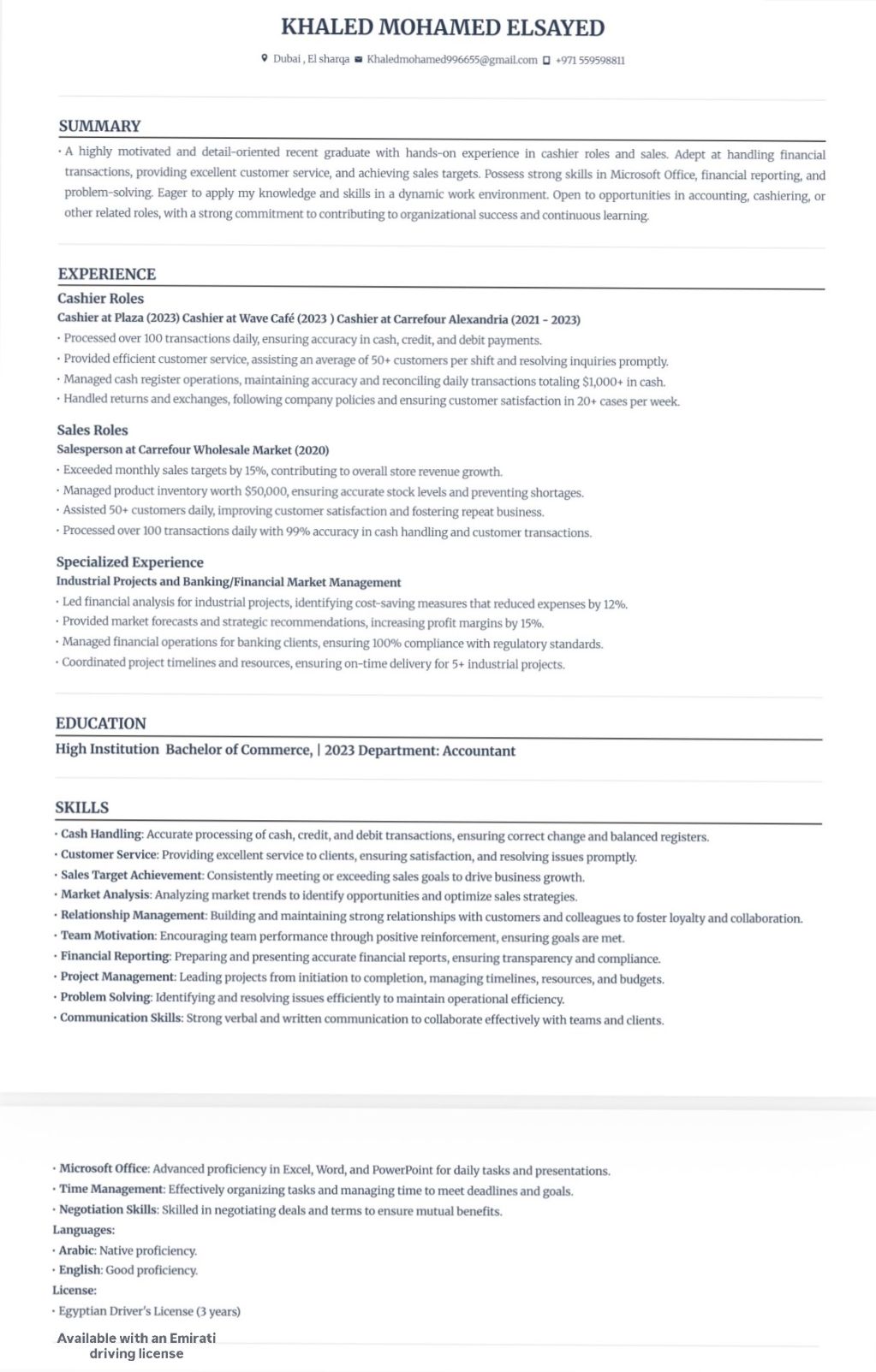 Holder of a Bachelor’s degree in commerce - General Division, specialized in Banking, Capital Management, and Industrial Project Administration. Detail - oriented and skilled in financial reporting, analysis, and operational management, with hands - on experience in cashier and sales roles at Carrefour and Plaza, enhancing customer service and cash - handling abilities. Proficient in Microsoft Office