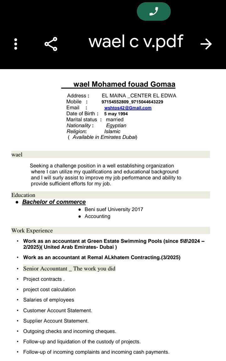 ابحث عن وظيفة محاسب أنا مصري ولدي اقامة وخبرة في الدولة سنة وخبرة في مصر 5 سنوات