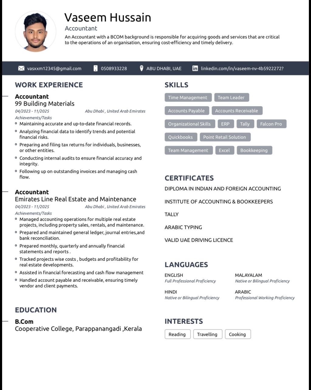My name is vaseem husain. Am from india Kerala, I am looking for job as an accountant. I have 3 years experience as an accountant in real estate, Building Materials and construction, I have valid UAE driving license and now am in Abu Dhabi Mussafah Shabiya 10
