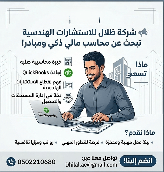 شركة ظلال للاستشارات الهندسية فرع أبوظبي تبحث عن محاسب مالي (مبادر ودقيق) للانضمام لفريقنا، لديه القدرة على تنظيم وإدارة الجوانب المالية والمستحقات بكفاءة عالية. المهام المطلوبة إدارة كاملة لبرنامج Quickbooks تسجيل العمليات بدقة وضمان تحديث البيانات. متابعة التحصيل (Receivables) جدولة ومتابعة مستحقات الشركة لدى العملاء. الضريبة والقيمة المضافة معالجة الفواتير والمستحقات بما يتوافق مع قوانين الضرائب