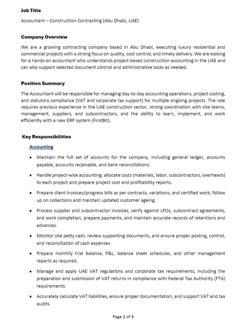 We are a growing contracting company based in Abu Dhabi, executing luxury residential and commercial projects with a strong focus on quality, cost control, and timely delivery. We are looking for a hands - on accountant who understands project - based construction accounting in the UAE and can also support selected document control and administrative tasks as needed