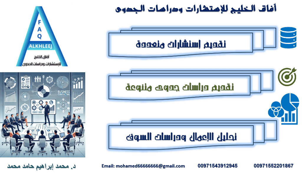 تقديم أفضل الاستشارات التسويقية تحليل السوق وتطوير الاستراتيجيات التسويقية، إدارة الحملات التسويقية تقديم الاستشارات الادارية اعادة الهيكلة التنظيمية تحسين العمليات إدارة التغيير تقديم استشارات الموارد البشرية تطوير سياسات الموارد البشرية إدارة الأداء إدارة النزاعات وتقديم الاستشارات المالية تحليل الاستثمار وإدارة المخاطر تحليل احتياجات التكنولوجيا تقييم احتياجاتها من التكنولوجيا