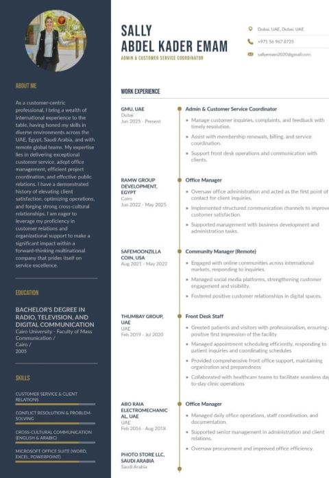 موظفة ادارية / سكرتيرة تنفيذية تبحث عن عمل في دبي أنا ابحث عن وظيفة في المجال الاداري أو الاستقبال. حاصلة على شهادة الماجستير في القانون الاداري، لدي خبرة عملية في اعداد التقارير وتنظيم الملفات وتسيير المعاملات الادارية. أتمتع بروح المسؤولية، وحسن التعامل مع الزبائن، والقدرة على تنظيم الوقت والعمل الجماعي. متاحة للعمل فورا