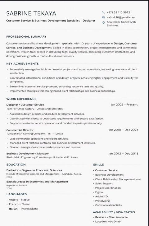 خريجة اقتصاد وتجارة عالمية، لدي خبرة في الإدارة ومجال العطور. أتمتع بمهارات تواصل قوية وأجيد العمل ضمن فريق. أتحدث العربية والفرنسية والإيطالية. ابحث عن فرصة عمل مناسبة لتطوير مهاراتي والمساهمة في نجاح المؤسسة. متوفرة حاليا في أبوظبي ولدي اقامة سارية. للتواصل