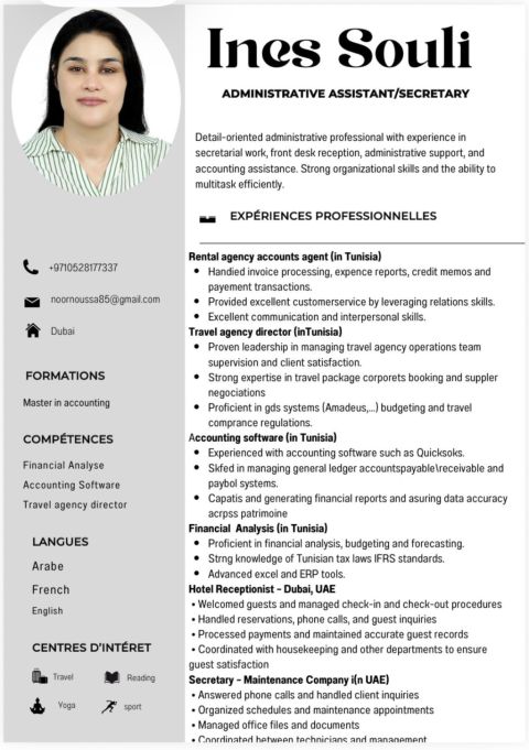 باحث عن فرصة عمل في مجال الإدارة أو الأعمال الادارية داخل دولة الامارات. لدي خبرة في تنظيم الأعمال الادارية، متابعة المهام اليومية، تنسيق المواعيد والملفات، وإدارة البيانات والتقارير بشكل منظم ودقيق. أجيد استخدام الكمبيوتر وبرامج Microsoft Office (Word - Excel) ولدي القدرة على تنظيم العمل والتعامل مع ضغط العمل والالتزام بالمواعيد، بالاضافة الى مهارات جيدة في التواصل والتعامل مع فريق العمل والعمل