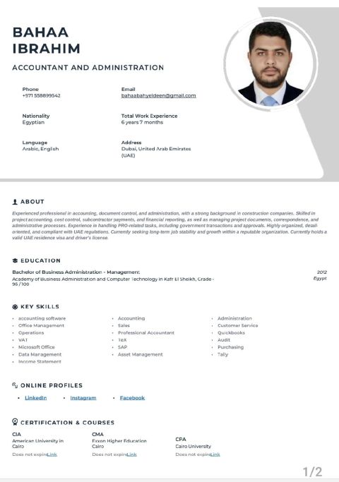 محاسب اداري ذو خبرة في شركات المقاولات. يتمتع بمهارات عالية في محاسبة المشاريع، وإدارة الوثائق، والمعاملات الحكومية عبر نظام العلاقات العامة. لديه معرفة واسعة بالعمليات الادارية وتوثيق المشاريع. متاح للبدء فورا. يحمل تأشيرة إقامة سارية المفعول في دولة الامارات العربية المتحدة ورخصة قيادة اماراتية
