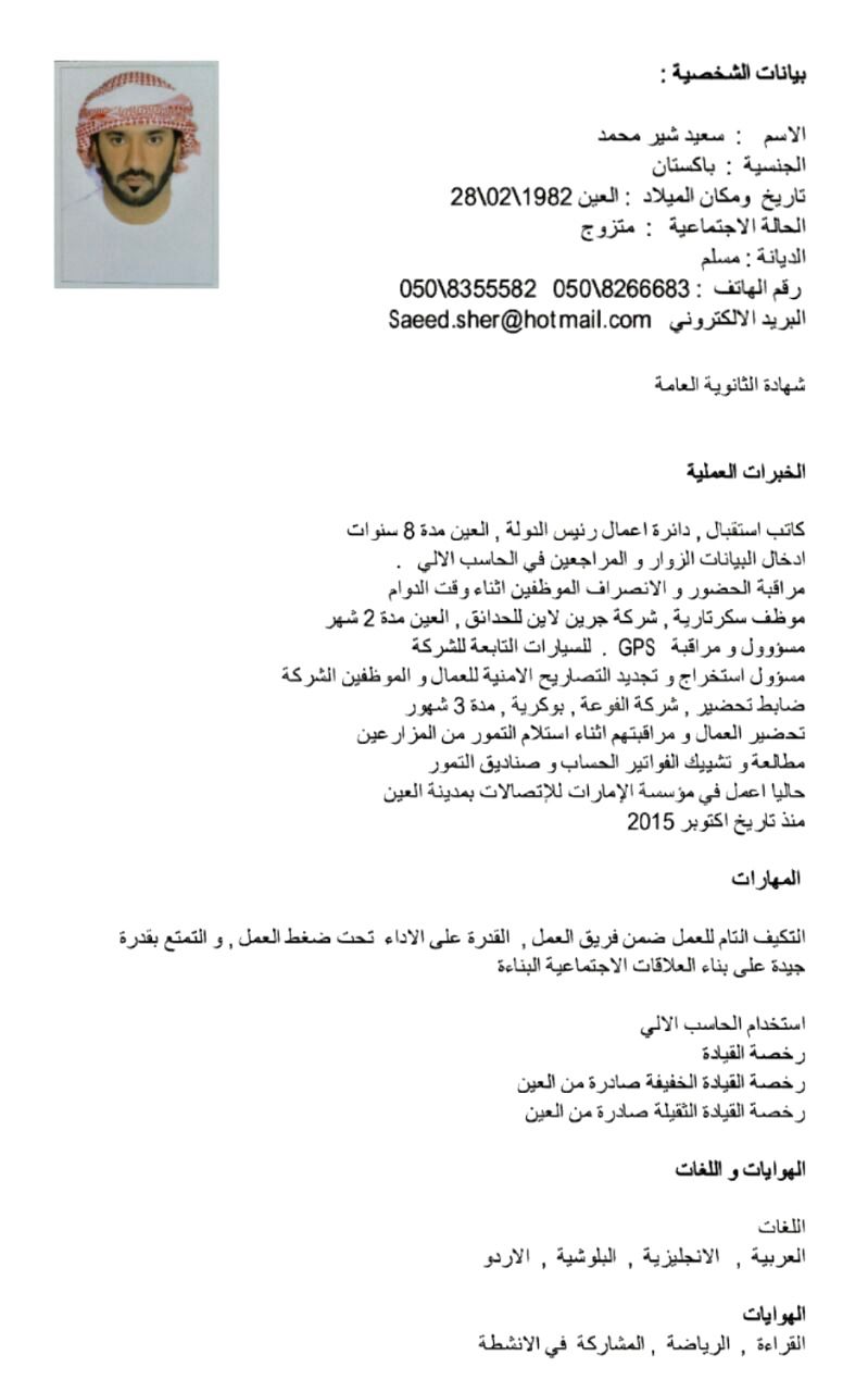 ابحث عن وظيفة مناسبة شاب بالوشيء من باكستان مولود في العين، مثقف ومتعلم وحسن الخلق أجيد لغة العربية والانجليزية والأردو، ابحث عن وظيفة ادارية أو مندوب خاص أو مرافق شخصي. ولدي خبرة وظيفية أكثر من عشرين سنة في الدولة