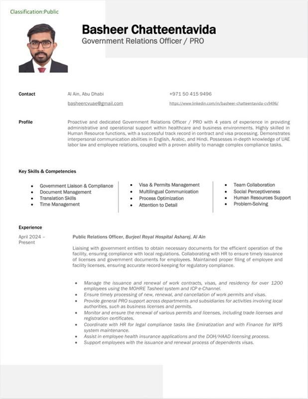 Proactive and dedicated Public Relations Officer/ Government Relations Officer with 4 years of experience in providing administrative and operational support within healthcare and business environments. Highly skilled in Human Resource functions, with a successful track record in contract and visa processing. Demonstrates interpersonal communication abilities in English, Arabic, and Hindi. Possesses