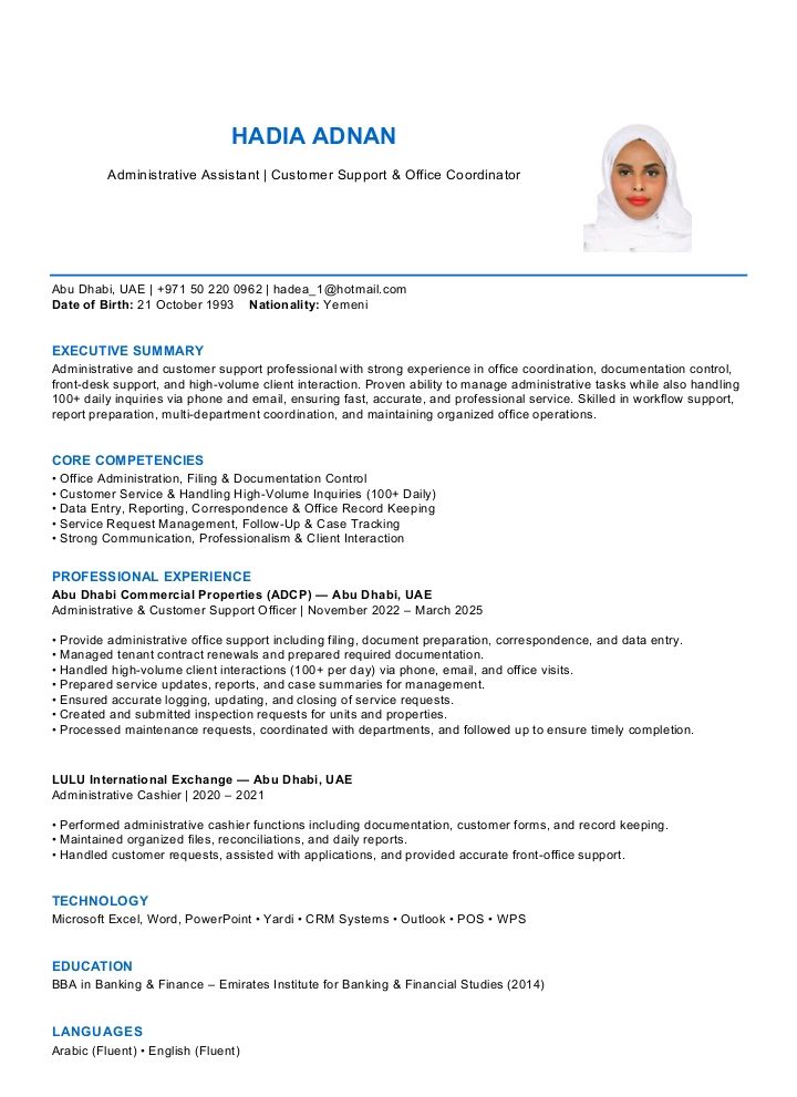 I am seeking a job in Abu Dhabi Where I can apply my skills, support the team, and I am open and ready to work in other areas as well. I possess three years of experience in administration and customer support at ADCP. My skills include managing office tasks, file management, providing customer support both phone and in person, following up on transactions with authorities, and Using Ms office