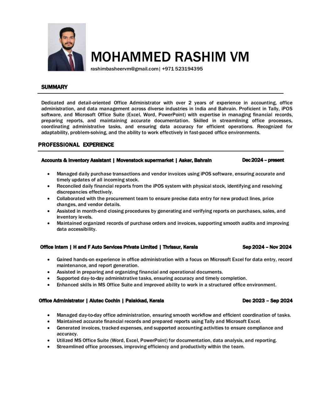 Dedicated and detail - oriented Office Administrator with over 2 years of experience in accounting, office administration, and data management across diverse industries in India and Bahrain. Proficient in Tally, iPOS software, and Microsoft Office Suite (Excel, Word, PowerPoint) with expertise in managing financial records, preparing reports, and maintaining accurate documentation. Skilled in streamlining