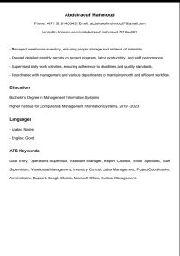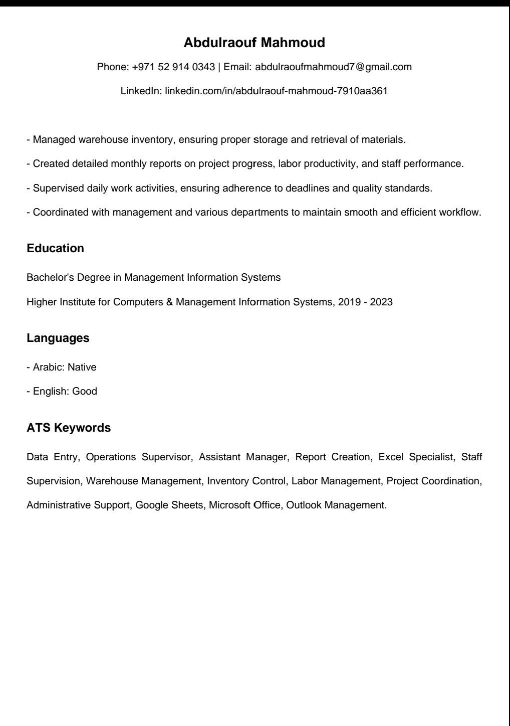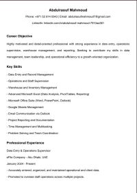 Data Entry & Operations Supervisor Experienced in data entry, operations supervision, warehouse management, and reporting using Excel and Google Sheets. Currently working with an electronic archiving company in Abu Dhabi. Detail - oriented, organized, and able to work under pressure. Looking for a suitable opportunity to grow and add real value to the company. Abu Dhabi - Available for interview