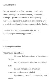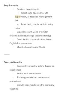 Job Title Warehouse Supervisor Location Mafraq Industrial city Abu Dhabi, UAE full time 6 days per week (1 day off - based on operations. Contact Only