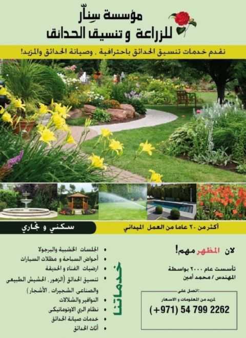 نقوم بعمل جميع أنواع اللاند سكيب وزراعة الحدائق وعمل شبكات الري الحديثة. وعمل نوافير وشلالات. وباربيكيو. لدينا كل ماهوا جديد في مجال الزراعة. ونقوم بصيانات شهريه وعقود سنويه خبرة أكثر من عشر سنوات في الخليج مهندس / سعد بدر المالكي
