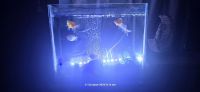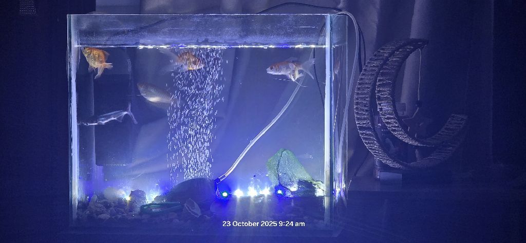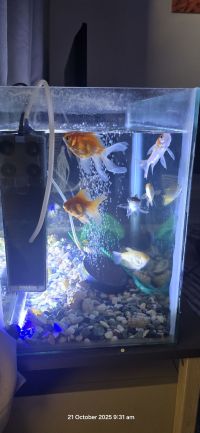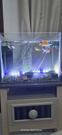 For sale Fish aquarium tank (60*30*40 cm) with 6 fish, 2 filters, a powerful 4 - outlet motor, a flat circular air bubble outlet, stones, aquarium decorations, and a fish net. Price AED250