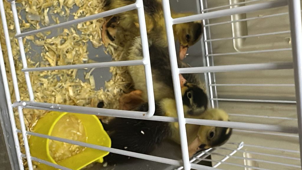 3 ducklings with their supplies, in Abu Dhabi. Each duckling costs 30 dirhams, meaning the total is 150 dirhams including supplies food, cage, water dish, and feed