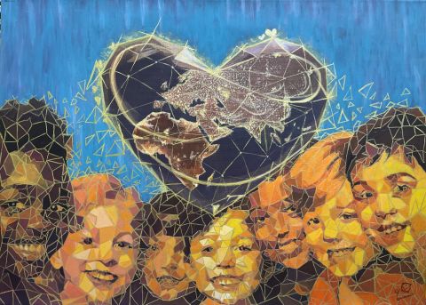 نبض العالم "لوحة آسرة تنبض بروح الانسانية المشتركة، وتعبر عن قلب واحد ينبض بتنوع البشرية ووحدتها. في هذا المشهد البصري العميق، تتجمع وجوه الاطفال من مختلف الأصول والخلفيات، مشكلة نسيجا وأحدا من البراءة والأمل. ترسم هذه الوجوه بأسلوب فسيفسائي يبرز تفرد كل فرد، بينما يوحدهم خط ذهبي يمتد ليشكل قلبا عملاقا في المنتصف، يحتضن بداخله خريطة العالم. هذا القلب الذهبي ليس مجرد شكل، بل هو" بوابة "للطاقة والحب