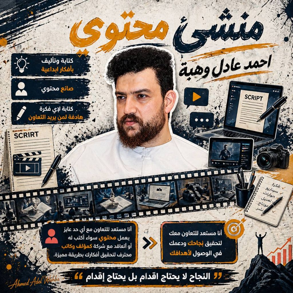 كل فيلم بيبدأ بفكرة وكل اثر بيبدأ بكلمة أنا هنا على شان أحول رؤيتك لسيناريو سينمائي وسكتشات توعوية تلمس قلوب الناس وتغير مفاهيمهم لو بتدور على كاتب يجسد لك الرسالة في قالب درامي أو كوميدي هادف يشد الانتباه فأنا جاهز نكتب القصة سوا وجاهز للتعاون معك بنظام التعاقد المستمر أو بنظام السكتش المنفرد بشكل احترافي يضمن لك الجودة والتميز خلنا نصنع محتوى يعيش ويترك بصمة حقيقية في وعي الجمهور