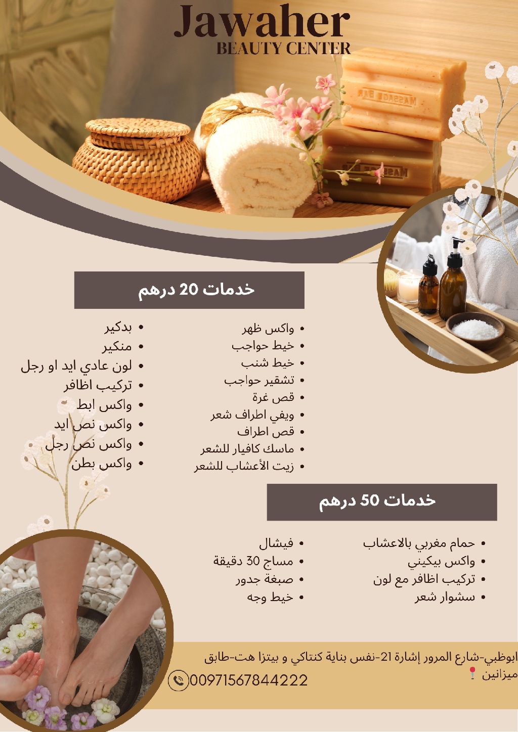 Jawahir Beauty Center Abu Dhabi Pamper yourself with the best prices Winter offer for the first time Choose any service for AED20. Protein or keratin treatment for any hair length for AED300 and roots for AED100