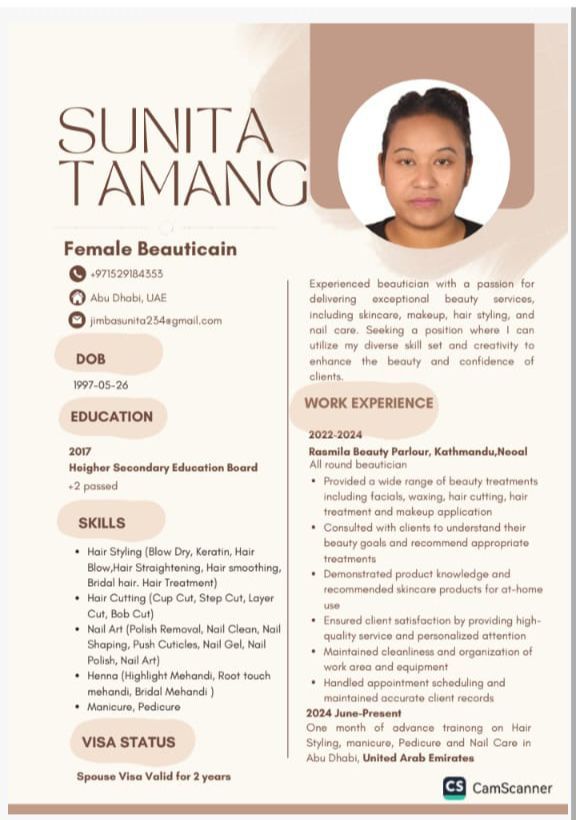 I am 2 years UAE experienced Nepali beautician. Available for door to door beauty services for ladies in Shabiya, MBZ and Mussafah. Will do manicure, pedicure, hair keratin, blow dry, facial, head massage, foot massage, shoulder and back massage, waxing and threading in reasonable price for ladies)