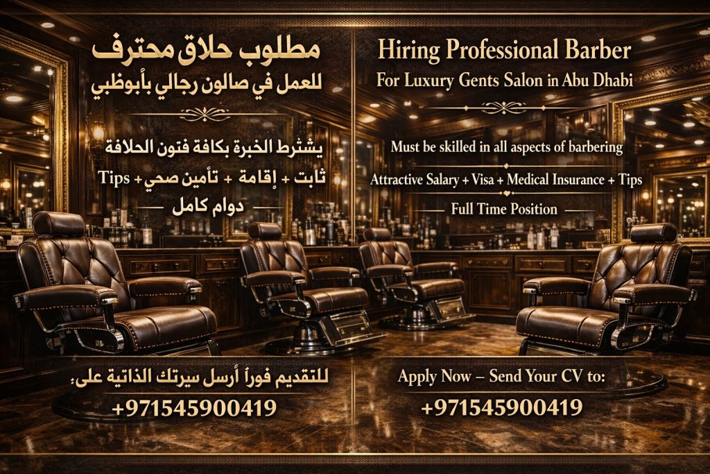 مطلوب حلاق رجالي لصالون فخم في أبوظبي راتب ثابت + إقامة + تأمين صحي + تيبس لديه خبرة في كافة القصات والتحديد والصبغات حسن المظهر والنظافة الشخصية والعامة يرجى إرسال السيرة الذاتية فقط بدون اتصال رجاء