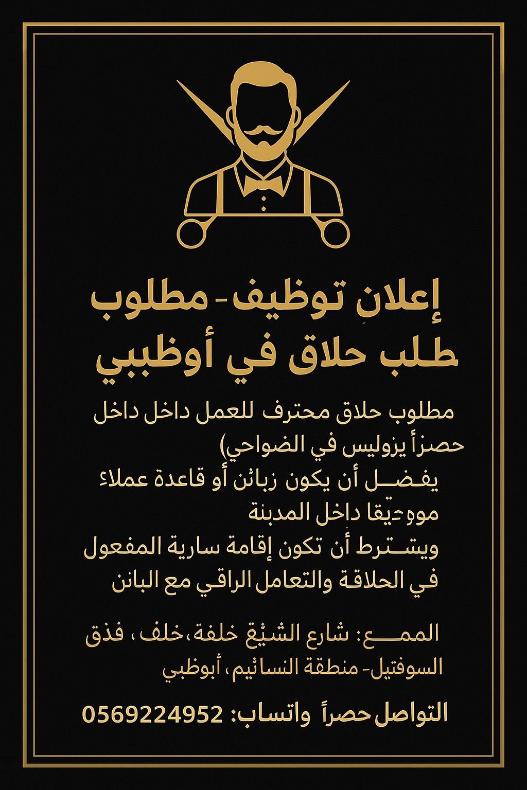 Looking for a professional barber to work exclusively within Abu Dhabi city (not in the suburbs) The ideal candidate should already have clients or a customer base in the city, hold a valid UAE residence visa, and have strong experience in men’ grooming and customer service. Location Sheikh Khalifa Street, behind Sofitel Hotel - Nasayem Area, Abu Dhabi Contact (WhatsApp only)