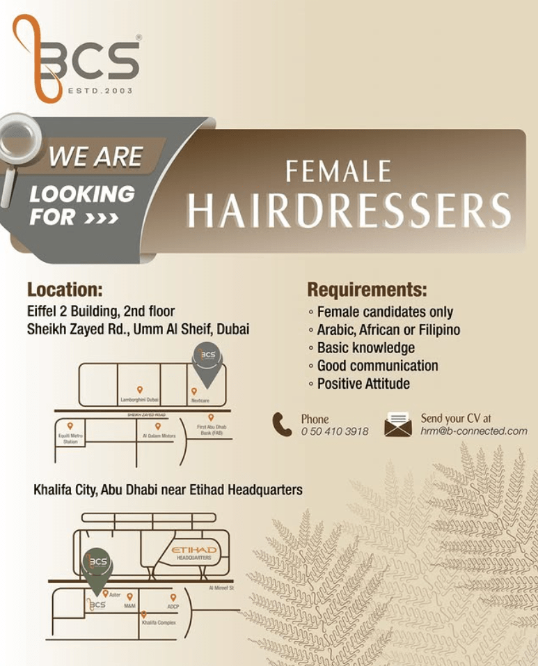 HAIR DRESSER HIRING Must Have 2 - 5 Years Experience Complete knowledge in, Hair Cut, Hair Styling, Hair Color and Blowdry. Good in Communication Positive Attitute Job Location Khalifa City, Abu Dhabi & Shk. Zayed Road Br, Dubai