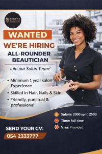 مطلوب خبيرة تجميل خبرة لا تقل عن سنة واحدة في صالونات التجميل ماهرة في الشعر والاظافر والبشرة ودودة، دقيقة في المواعيد، ومحترفة في أبو ظبي خلف المشرف مول