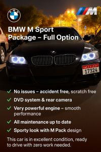 بي إم دبليو 3 سيريز - حزمة M، بحالة ممتازة. السنة: 2006. المسافة المقطوعة: 84,000 كم فقط. الحالة: 0 حوادث، 0 خدوش. محفوظة دائمًا في المرآب. الصيانة مكتملة بالكامل - لا حاجة لأي مصاريف إضافية. السعر: 18,000 درهم إماراتي.