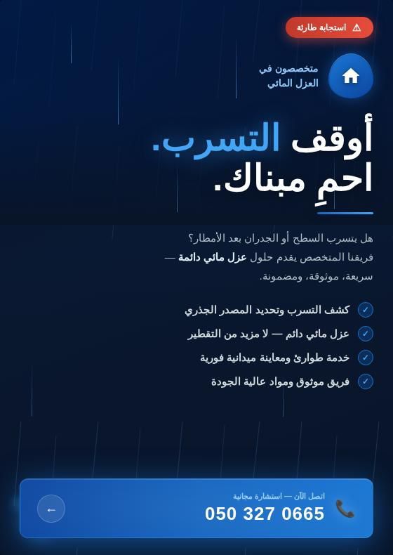 We are ready to provide those services please call us for any inquiries - Service tags Roofs, Basements, Bathrooms, Tanks, Retaining Walls - Animated water wave effect at the bottom - Get a Quote button + Dubai & Sharjah mention - Professional dark blue color scheme with water - blue accents