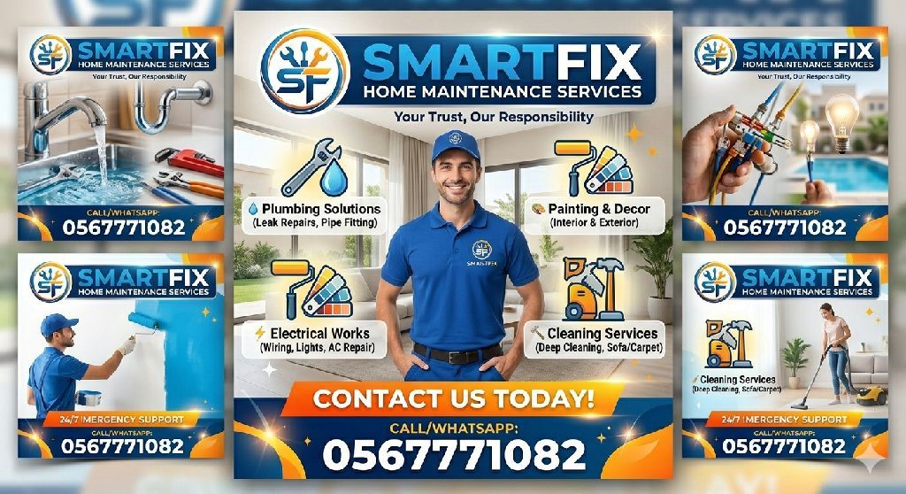 SmartFix Home Maintenance Services Our Services Include Plumbing (water leakage, pipe fixing, installation) Electrical (wiring, lights, sockets, troubleshooting) AC Repair & Installation Appliance Repair (fridge, washing machine, cooker, etc. Painting & Carpentry Work Door, Lock & Furniture Repair General Maintenance - all types of work. Why Choose Us Fast & On - Time Service