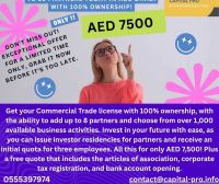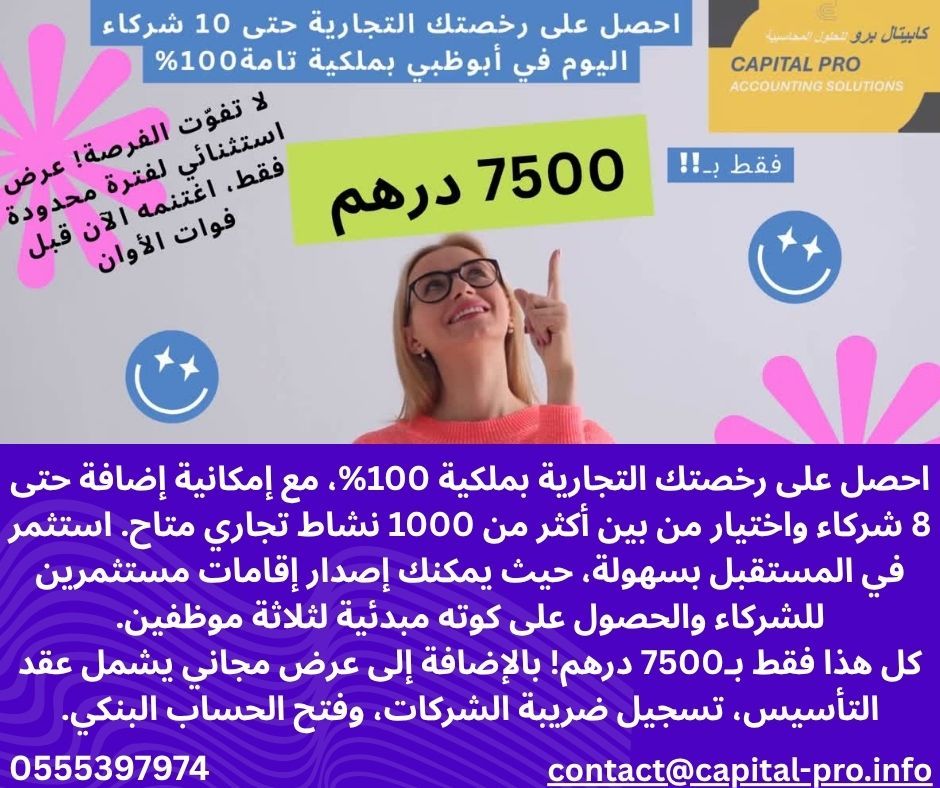 احصل على رخصتك التجارية بملكية 100% مع امكانية اضافة حتى 8 شركاء واختيار من بين أكثر من 1000 نشاط تجاري متاح. استثمر في المستقبل بسهولة حيث يمكنك اصدار اقامات مستثمرين للشركاء والحصول على كوته مبدئية لثلاثة موظفين. كل هذا فقط ب 7500 درهم بالاضافة الى عرض مجاني يشمل عقد التأسيس تسجيل ضريبة الشركات، وفتح الحساب البنكي. تواصل معنا للاتصال / 0262260220 - واتساب/ البريد الألكتروني / الموقع الالكتروني