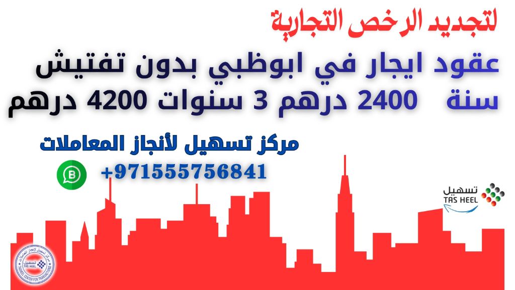 لو عايز تجدد رخصتك التجارية في أبوظبي بسهولة ومن غير أي تفتيش الحل عندنا قدمنا لك عقود إيجار جاهزة لتجديد الرخص التجارية بأسعار مميزة سنة واحدة بسعر 2400 درهم - بدون تفتيش 3 سنوات بسعر 4200 درهم - وبرضه بدون تفتيش وفر وقتك ومجهودك وخلينا نسهلها عليك من أول خطوة لغاية استلام الرخصة. للتواصل