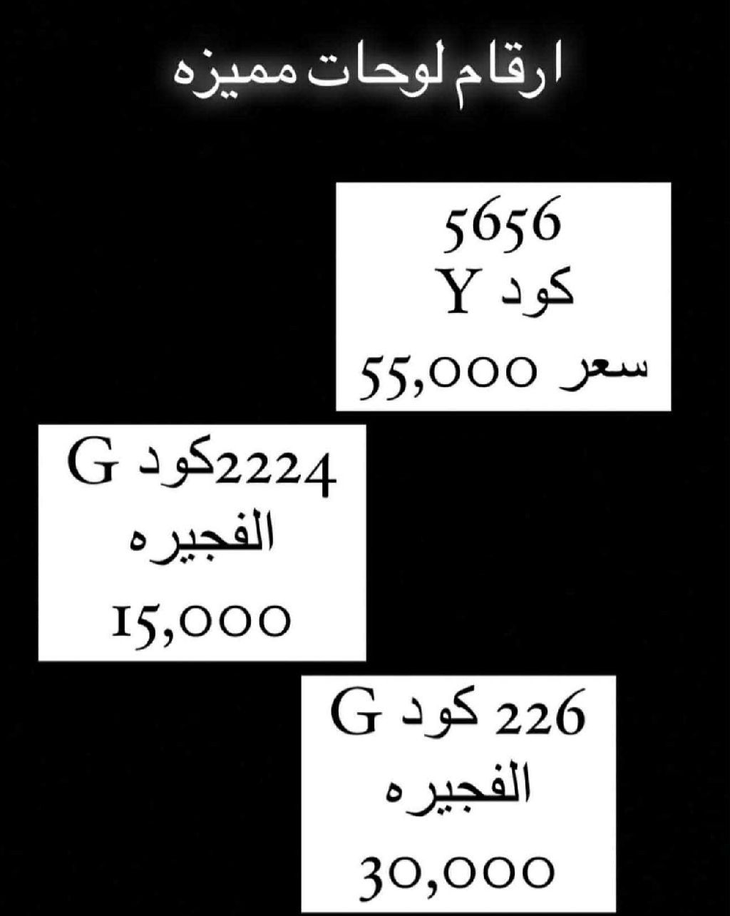 أرقام لوحات مميزة شخصية غير مستخدمه من قبل للبيع 226 G الفجيرة 2224 G الفجيرة 5656 Y الفجيرة للاستفسار