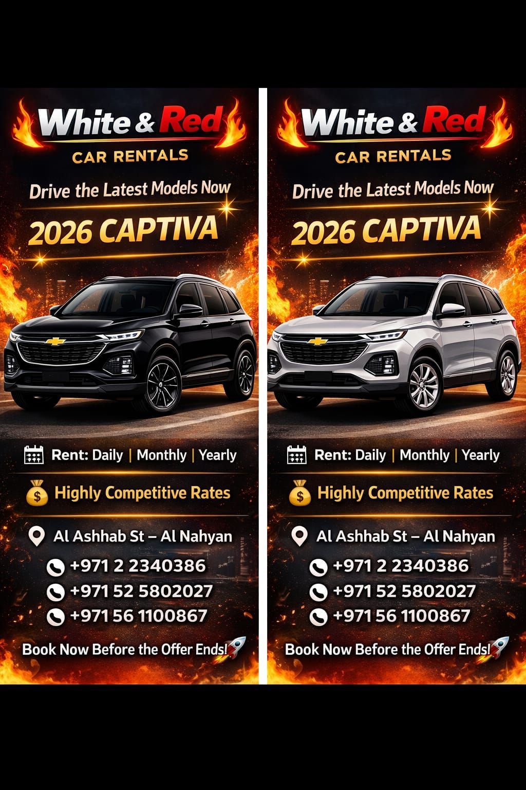 أقوى عروض تأجير السيارات في أبوظبي - وايت اند ريد هل تبحث عن سيارة حديثة بسعر منافس نوفر لك أفضل العروض اليومية - الشهرية السنوية على أحدث الموديلات شفروليه كابتيفا 2026 هيونداي أكسنت 2026 نيسان صني 2025 سيارات نظيفة وجاهزة للتسليم أسعار تنافسية تناسب الجميع خدمة سريعة وثقة وأمان العنوان شارع الأصحاب - آل نهيان، أبوظبي للتواصل والحجز
