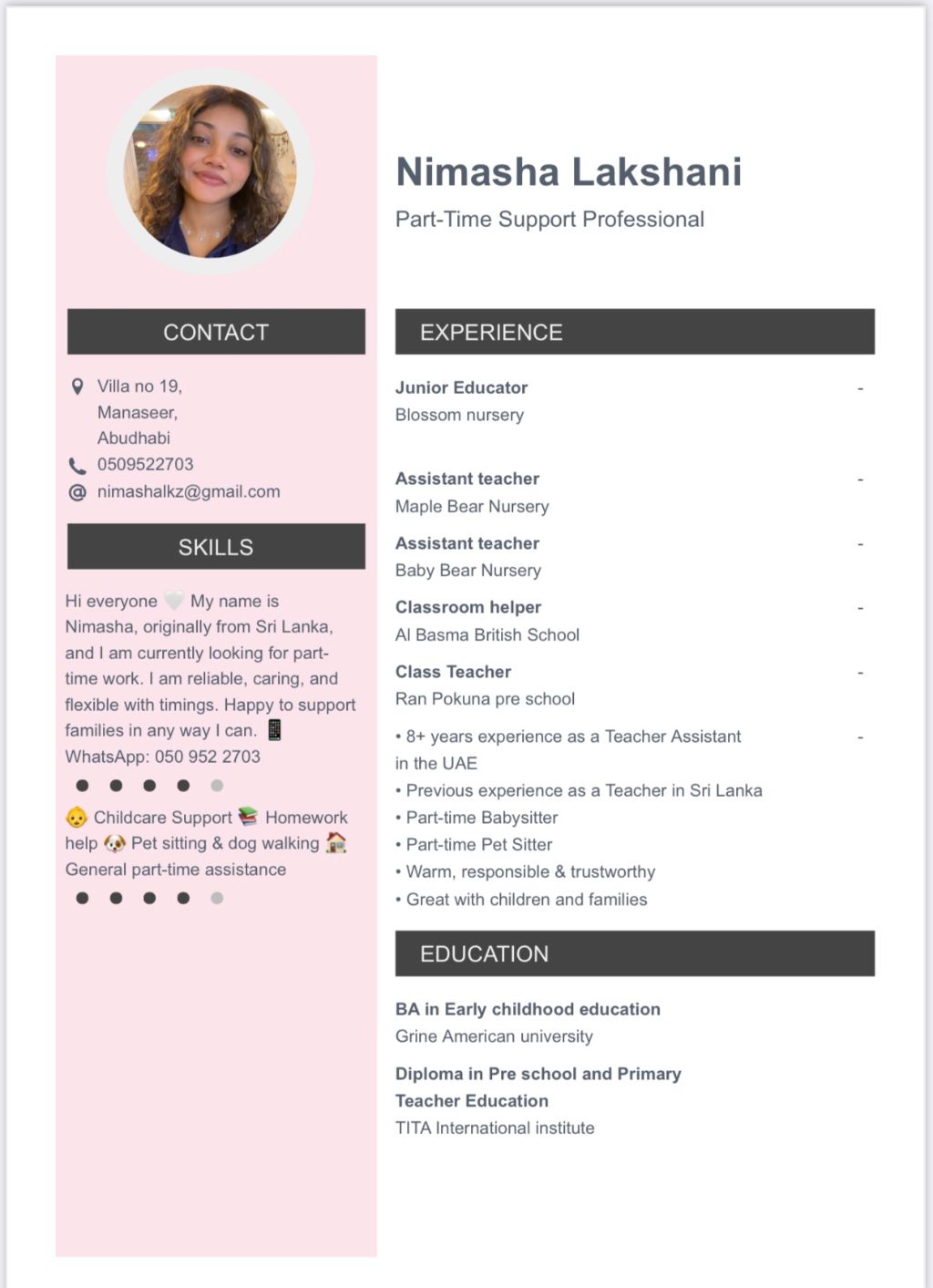 Part time HELP Available Hi everyone My name is Nimasha, originally from Sri Lanka, and I am currently looking for part time work. I am reliable, caring, and flexible with timings. Happy to support families in any way I can