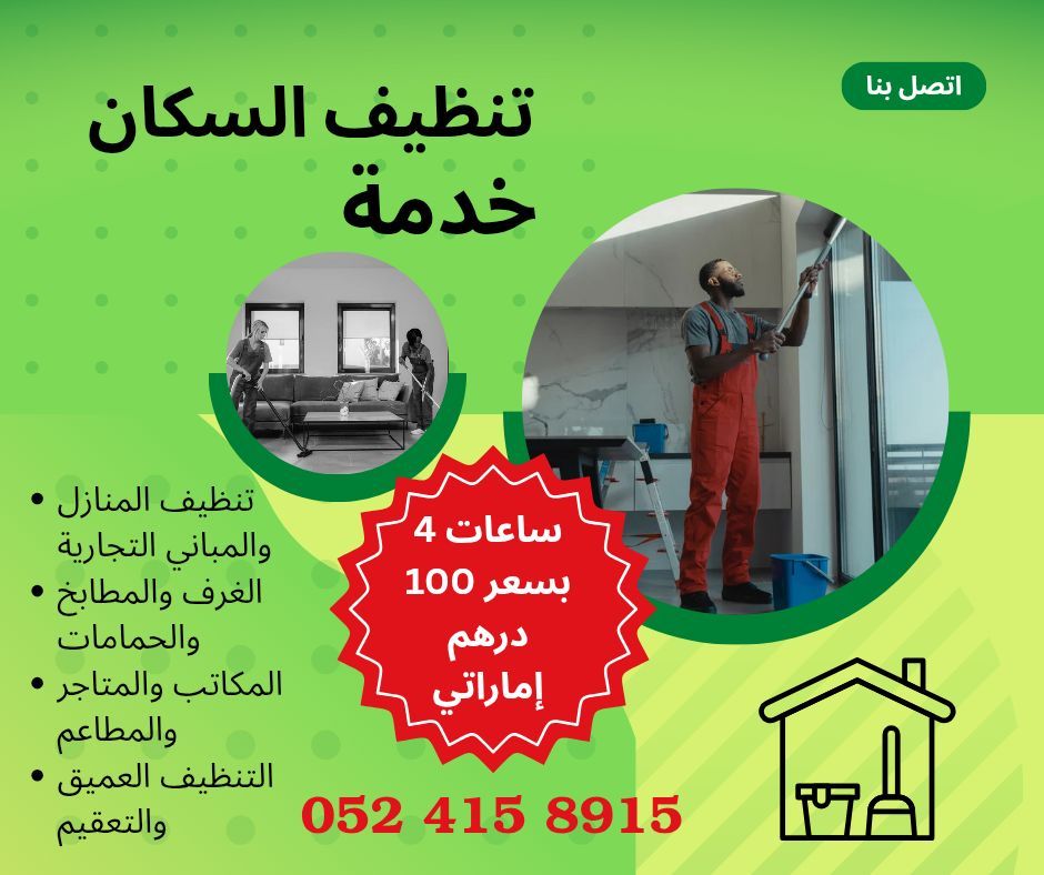 خدمات تنظيف في أبوظبي بأسعار مخفضة. 4 ساعات ب 100 درهم اماراتي وساعة واحدة ب 25 درهما اماراتيا. احجز الآن لخدمات تنظيف منزلك وفللتك