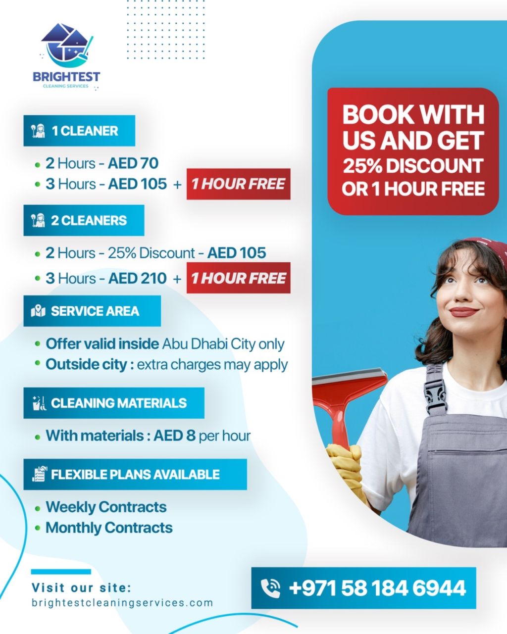 Book with us and Get 1 hour FREE or up to 25% off on all our top cleaning services, Your home deserves the brightest clean, Only Philippines staff, Home Cleaning, Office Cleaning, Villa Cleaning, Kitchen Cleaning/ Balcony Cleaning, Deep Cleaning & Normal Cleaning, Move in/ Move out cleaning, Ironing/ Washing/ Folding, Trained staff, Trusted service Easy booking, Offer valid inside Abu Dhabi only