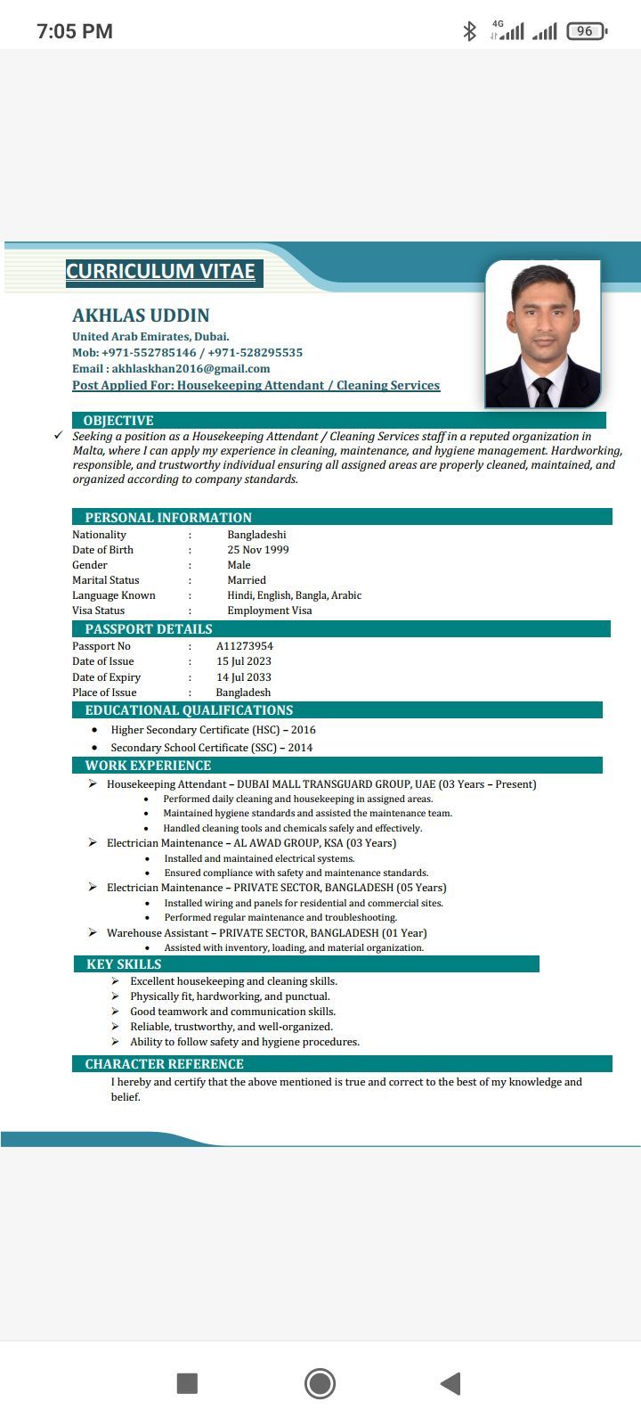 أنا أخلاق الدين، من بنغلادش، عمري 27 عاما، متزوج. ابحث عن عمل، ولدي تأشيرة وبطاقة هوية. هذه خبرتي العملية عامل نظافة - دبي مول، مجموعة ترانس جارد، الامارات العربية المتحدة (3 سنوات - حتى الآن) أقوم بأعمال التنظيف والصيانة اليومية في المناطق المخصصة لي. أحافظ على معايير النظافة وأساعد فريق الصيانة. أستخدم أدوات ومواد التنظيف بأمان وفعالية. فني صيانة كهربائية (3 سنوات) أقوم بتركيب وصيانة الأنظ