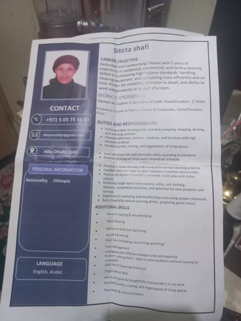 My name is selam umer am from ethopian and I looking for job I have experience 4 years house keeping in UAE I can speaking well Arabic and English and I have resident visa 2 years