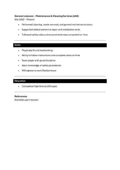 I am from Ethiopia and new for UAE but I have fast learning scale at any situation and I have good comincation whith my job and whith my management